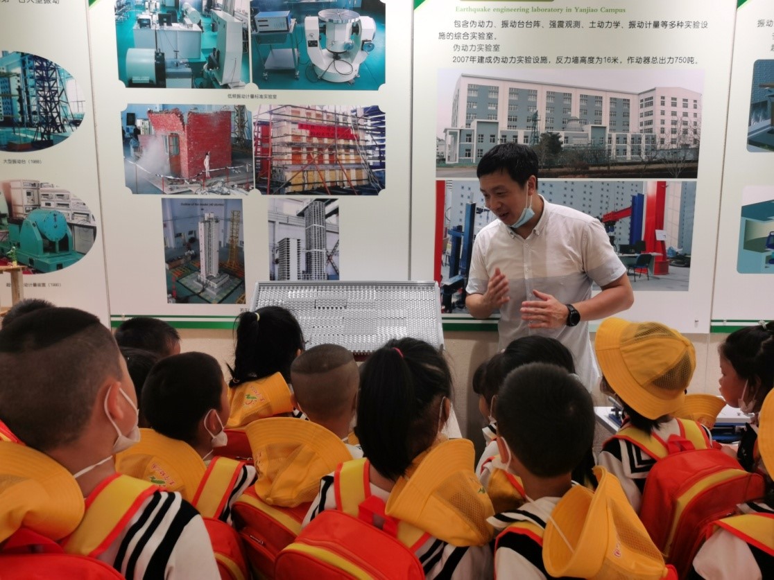 講座結束后,張昊宇博士帶領學生們進行了一系列的科普實驗。首先是參觀鐵路地震監測預警系統展臺,講解地震后該系統如何保障高鐵安全運行的原理;其次回答學生關于“中國古建筑為何能夠跨越千年不倒”的問題,為學生講解中國傳統木結構的抗震機理;最后進行的微型振動臺模擬實驗和搖擺墻結構無損倒塌模型實驗是活動中學生們最喜歡的環節,每一位學生都親手操作搖擺墻結構無損倒塌模型,近距離直觀的認識到不同建筑結構抗震能力的強弱區別,學習了建筑結構抗震的基本知識。