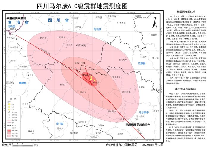 2022年6月10日,四川阿壩州馬爾康市先后發生5.8、6.0、5.2級地震,屬震群型地震。地震發生后,按照應急管理部部署,中國地震局組織四川省地震局開展應急處置工作,依照《地震現場工作 第3部分:調查規范》(GB/T 18208.3-2011)、《中國地震烈度表》(GB/T 17742-2020),通過災區震害調查,并綜合應用儀器烈度、地震構造背景、余震分布、震源機制、遙感影像等科技支撐成果,確定了此次地震的烈度分布,并依照《地震烈度圖制圖規范》(GB/T 38226-2019)編制完成《四川馬爾康6.0級震群地震烈度圖》。