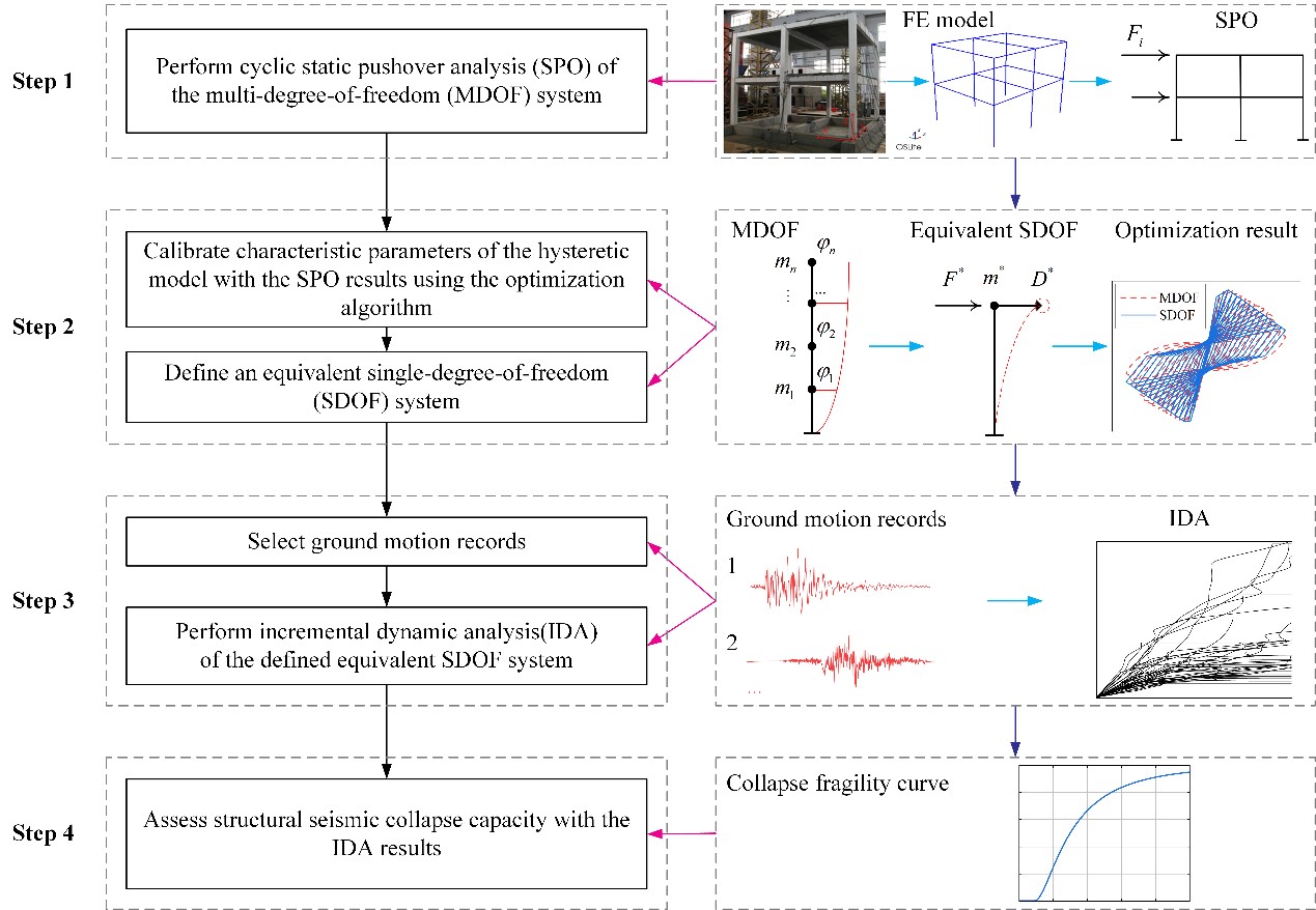 提出了一種結構抗倒塌能力高效評估方法(圖1)。該方法主要包括以下四個步驟:首先對多自由度結構建立有限元模型進行靜力往復推覆分析并得到其等效單自由度體系;其次采用優化算法校準單自由度體系骨架曲線和滯回特征參數;然后對等效單自由度體系進行增量動力分析;最后得到結構倒塌易損性曲線并評估結構抗倒塌能力。分別對RC純框架結構、鋼框架結構和RC填充墻框架結構進行抗倒塌能力評估,并與傳統抗倒塌能力評估方法計算結果對比,驗證和表明了本文所提方法的有效性和高效性。