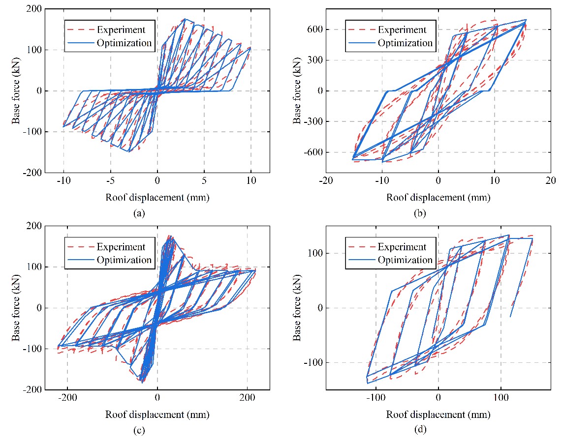(1)所提方法采用的ARO優化算法在識別單自由度模型參數上具有較高的精度,且對于不同類型結構的目標滯回曲線均可取得較好效果(圖2),理論上方法可以應用于不同類型結構。采用ARO優化算法識別414個框架柱試驗中骨架曲線和滯回參數,結果表明相較于現有其他優化算法,本文所提優化算法在實現結果同等精度前提下,優化計算效率可提升17.45%。