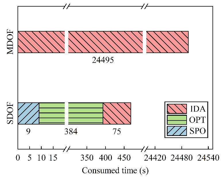 (3)相較于傳統直接采用多自由度有限元模型抗倒塌能力評估方法,采用本文所提等效單自由度方法進行抗倒塌能力評估,所需計算時間僅為傳統方法的2%(圖6),大幅度提升了評估計算效率。另外,本文所提方法不僅適用于單體結構,也可以推廣至城市尺度的群體結構抗倒塌能力評估。