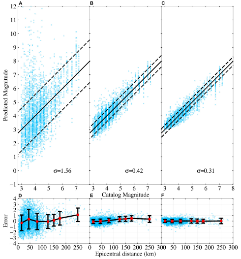 圖2 P波到達后3秒,(A,D)Tc方法、(B,E)Pd方法和(C,F)DCNN-M模型的震級估計