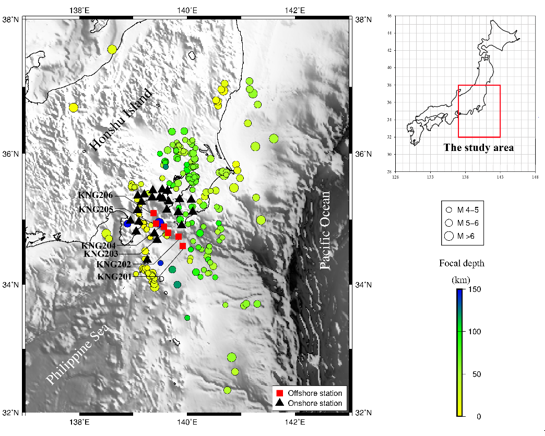 圖1 日本相模灣海底臺(tái)站、陸地臺(tái)站及地震震中分布圖