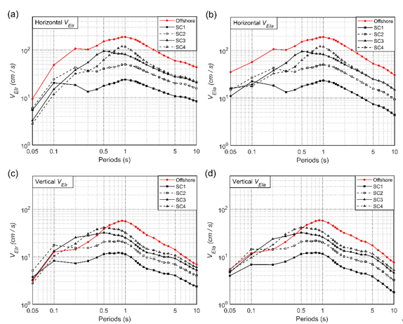 1) 從海/陸地震動(dòng)場(chǎng)地條件差異的角度探討建立了日本相模灣海域的海底地震動(dòng)輸入能量的水平和豎向衰減模型,通過(guò)隨機(jī)效應(yīng)模型回歸分析,在海底地震動(dòng)輸入能量譜的衰減模型中考慮震級(jí)、震源距、震源深度、地震類(lèi)型以及海底臺(tái)站場(chǎng)地效應(yīng)等的綜合影響,給出了海底和陸地地震動(dòng)在彈性輸入能量譜上的差異。海/陸地震動(dòng)衰減特征對(duì)比表明,海底水平向地震動(dòng)輸入能量明顯大于同級(jí)別的陸地地震動(dòng);海底豎向地震動(dòng)輸入能量在短周期小于陸地地震動(dòng),但在長(zhǎng)周期大于陸地地震動(dòng)(見(jiàn)圖2)。